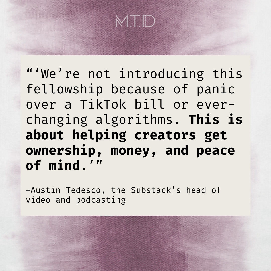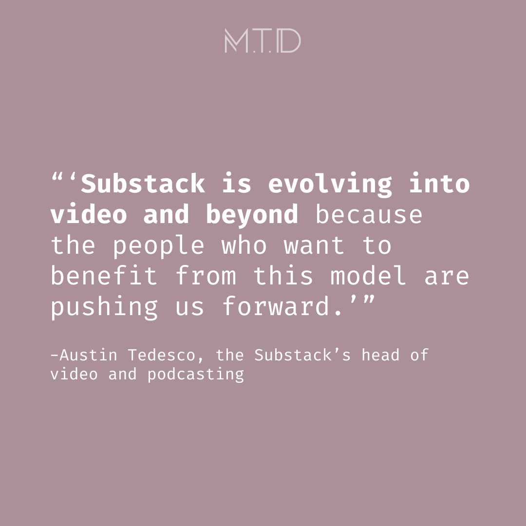 “Other platforms ‘offer rentals with unfriendly leases. At the same time, their business models can’t deliver the stability and predictability that creators need to produce their best work. It is hard enough to get by without having to worry about constant fluctuations in viewership and brand partnership revenue.’” - Austin Tedesco, the Substack’s head of video and podcasting